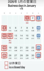 1月の営業日は以下の通りとなっております。よろしくお願いいたします。
